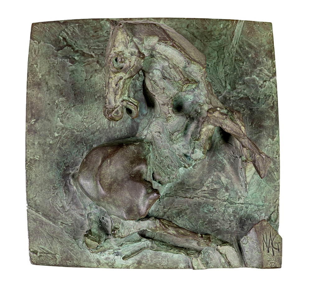 Nag Arnoldi Locarno 1928-Lugano 2017, Cavallo Scultura in bronzo cm 17x17x8 (27x27x11 con base in vetro temperato). Sul fronte reca incise firma e numerazione "Nag - 28/50".
