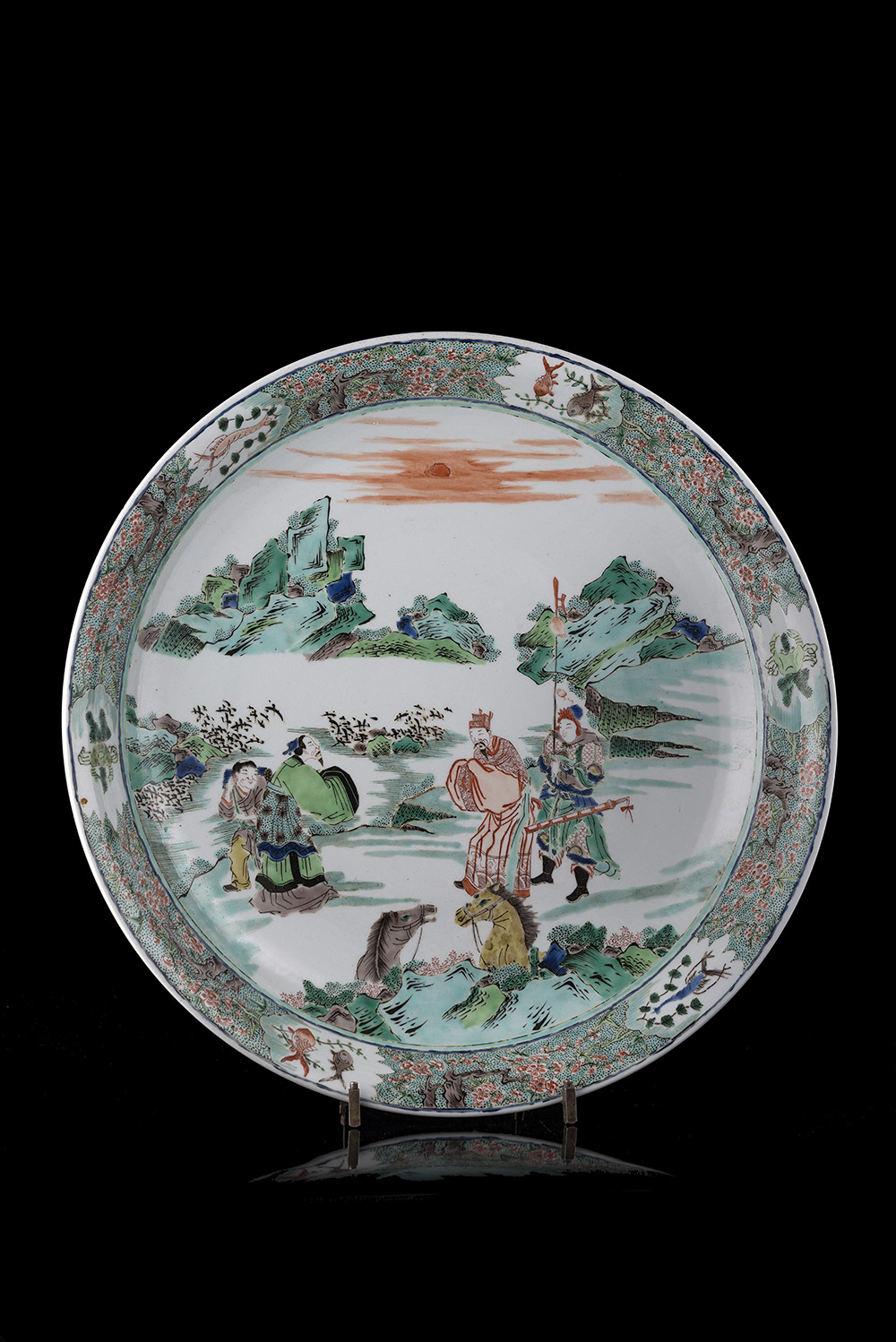 A large Famille Verte dish decorated with figures and horses in a mountain landscape