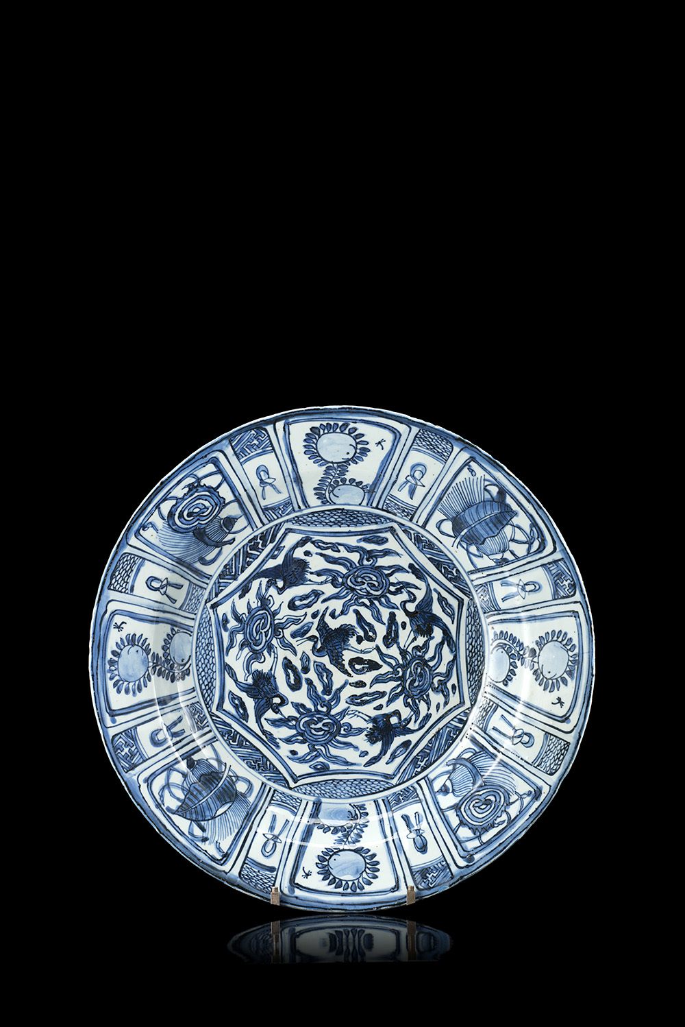 A blue and white porcelain 'kraak' dish, the cavetto decorated with panels, the centre with cranes in flight