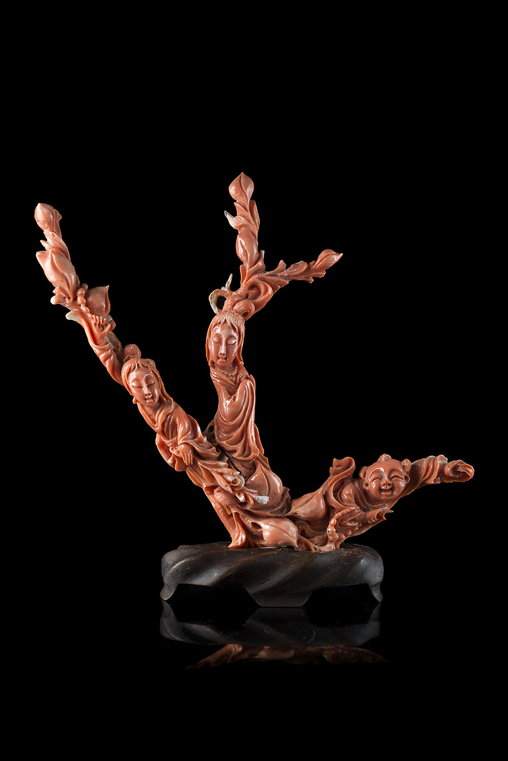 A coral branch carved with ladies and a smiling boy