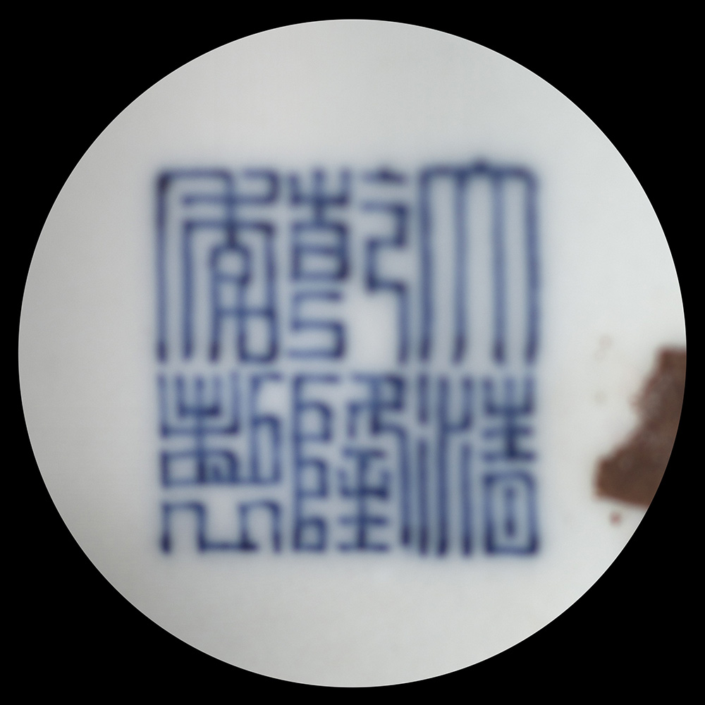 Vaso a bottiglia con decorazione floreale a smalti policromi su fondo rosso scuro, marchio apocrifo Qianlong
