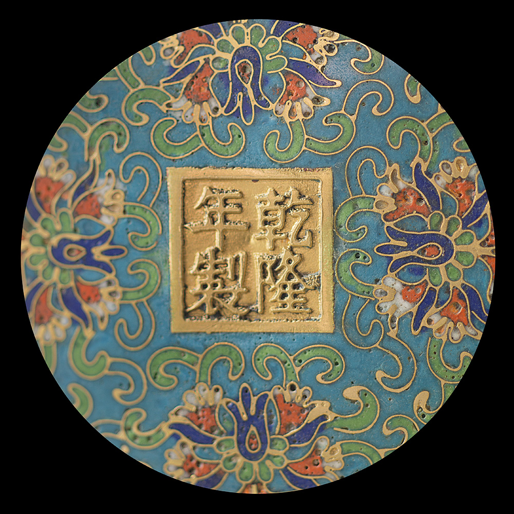 Vaso biansato in metallo cloisonné decorato con drago e fenice su fondo turchese, marchio apocrifo Qianlong, base in legno