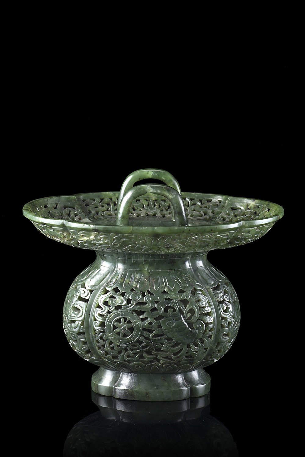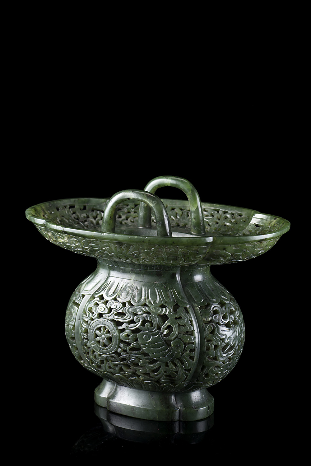 Vaso lobato con due anse in giada verde spinacio scolpito e intagliato con gli Otto Emblemi Buddhisti "bajixiang" contornati da motivi floreali