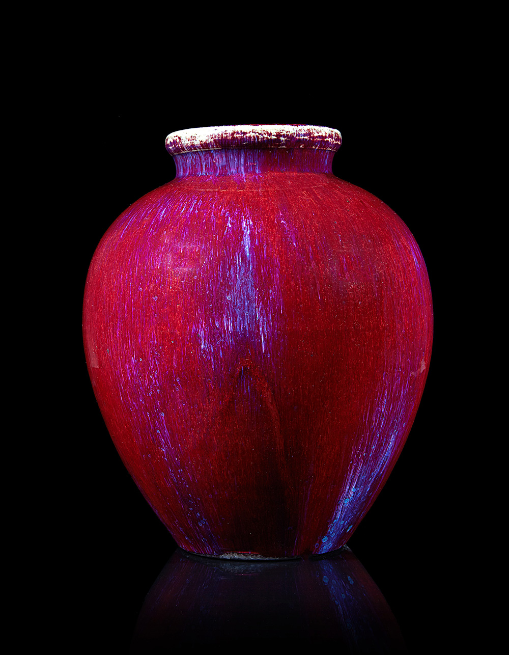 A flambè-glazed porcelain vase streaked in red and purple tones (slight defects)