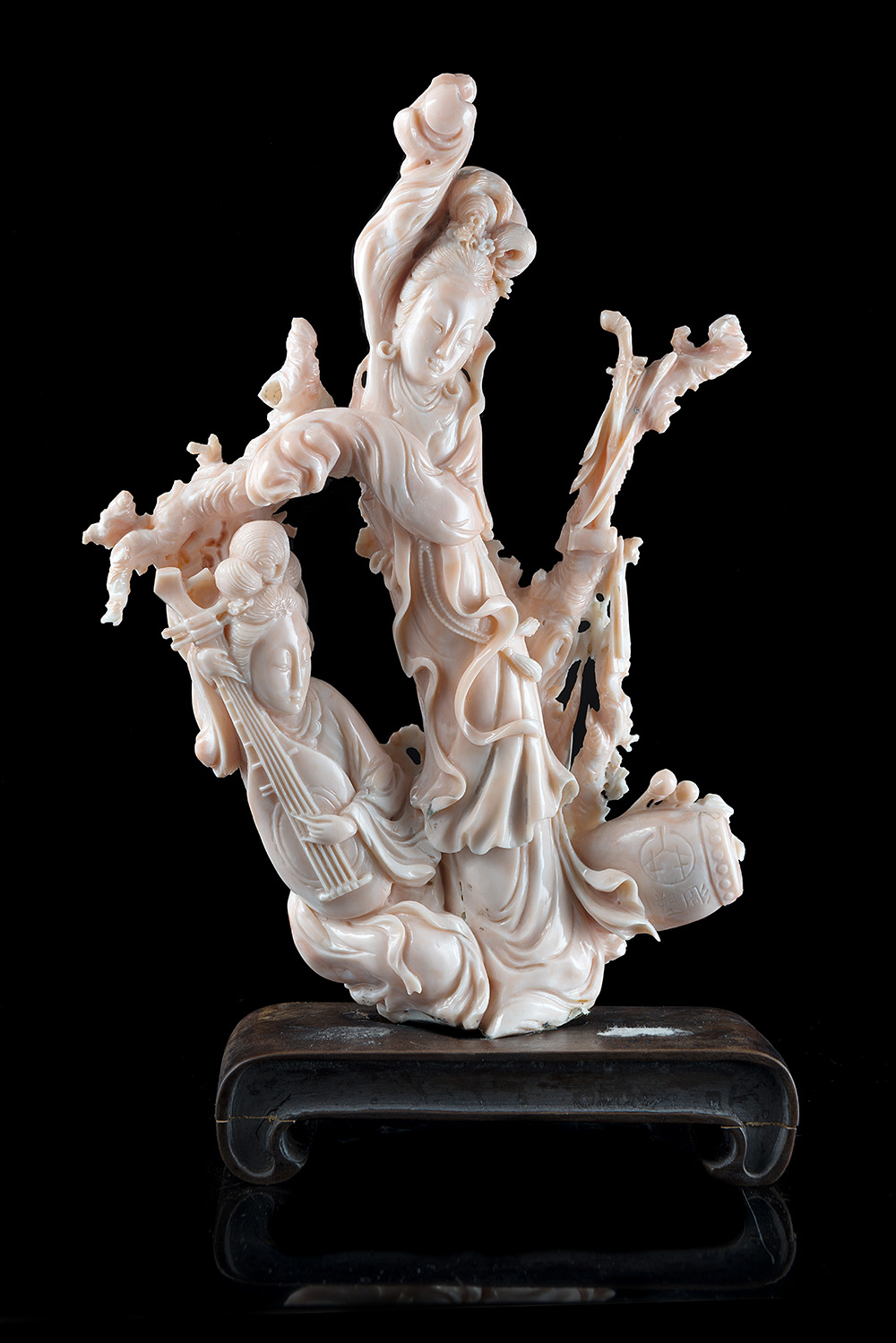 Ramo in corallo rosa chiaro scolpito con dame e strumenti musicali, con base...
