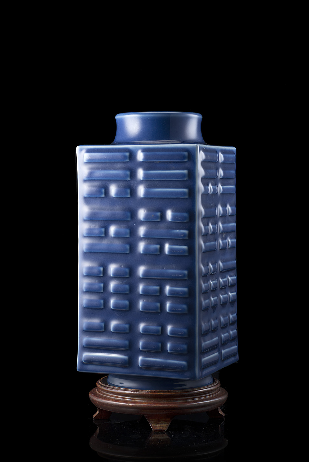 Vaso in porcellana dalla forma arcaica cong a invetriatura monocroma blu decorato in rilievo con gli "otto trigrammi", bagua, alla base marchio Tongzhi a sei caratteri e del periodo