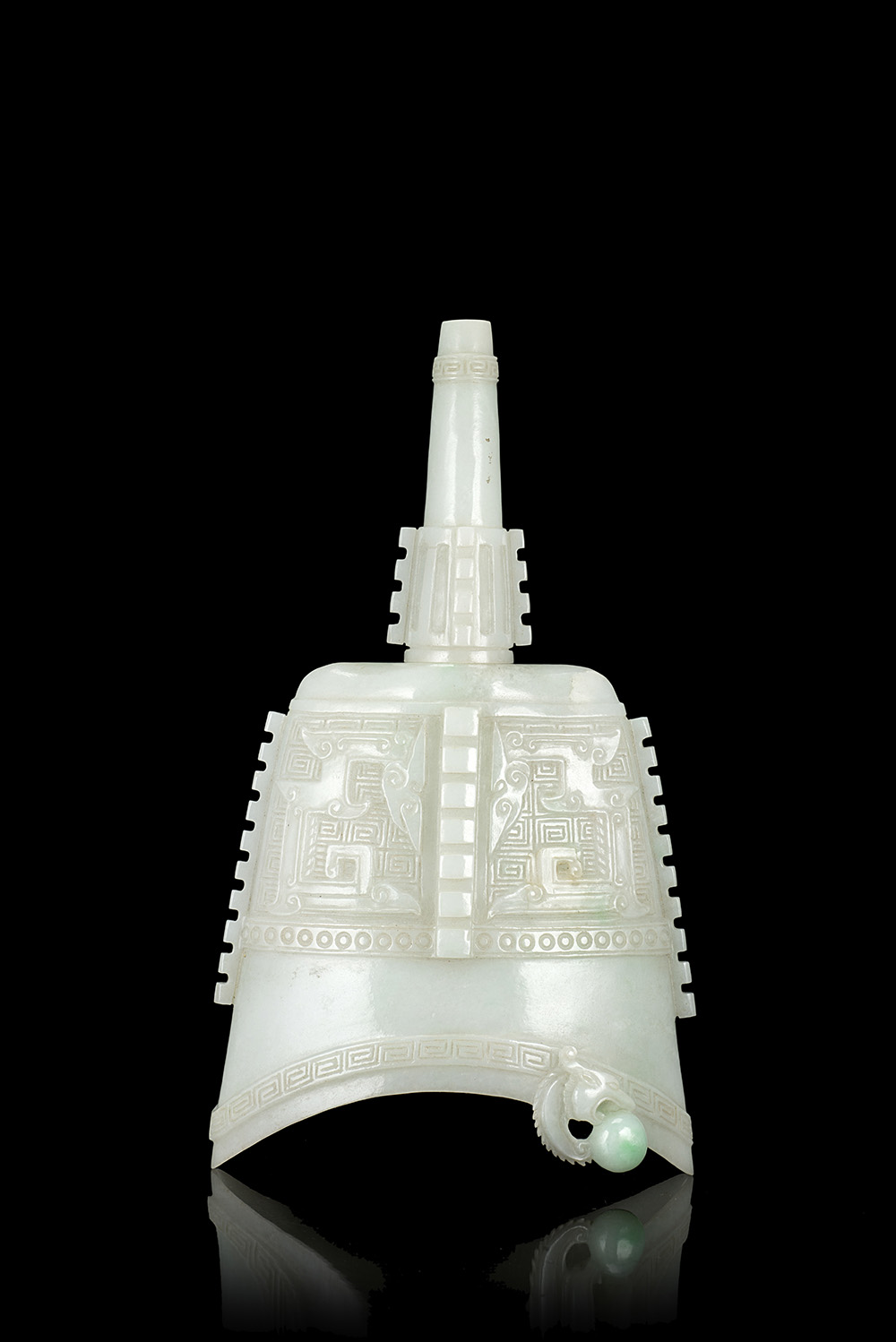 An archaistic jadeite bell, the stone of white and grey tone with apple green inclusions, decorated in relief with geometric motifs and panels incised with 'taotie' masks
