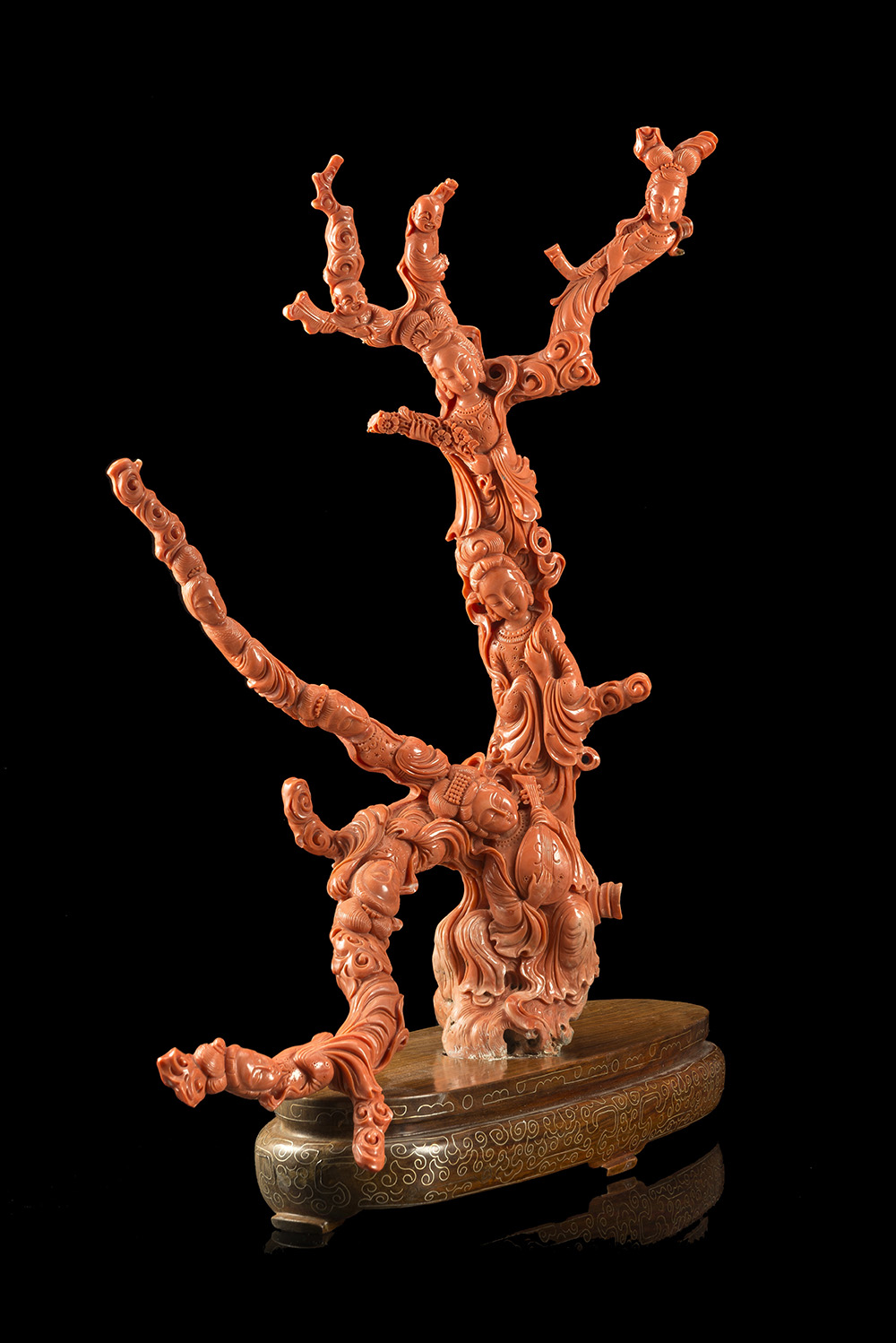 A large coral branch carved with elegant ladies carrying musical instruments and flowering branches