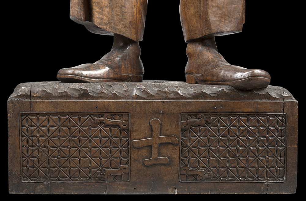 Scultura in legno 'nanmu' raffigurante studioso dall’espressione concentrata che legge un libro, vestito con lunga tunica e pantaloni, sulla base decorata a motivi geometrici è intagliato al centro l’ideogramma 'shi' che in cinese tradizionale corrisponde a 'funzionario dell’impero'