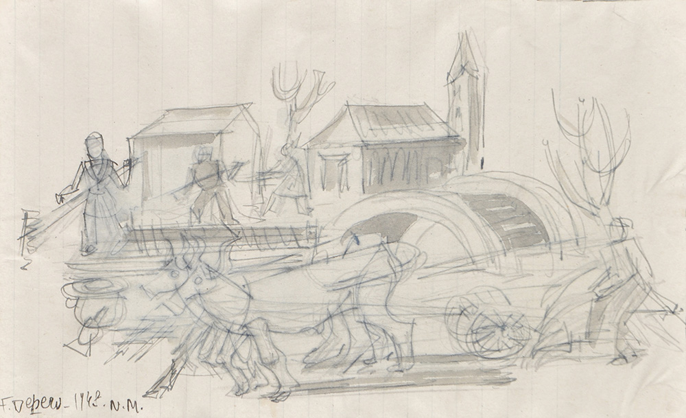 Fortunato Depero Scena di contadini, 1948;China su carta, 14 x 23 cm