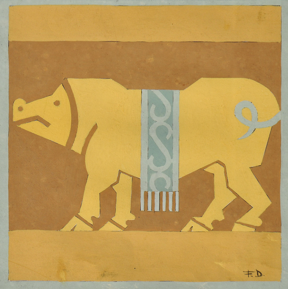 Fortunato Depero Maiale, 1938–39;Tempera su cartoncino, 18,5 x 19,5 cm, in cornice, monogrammaIl disegno è probabilmente uno studio di colore per il modulo centrale della tavola dedicata alla città di Benevento nel libro “96 tavole a colori per i Dopolavori Azien-dali in Italia”, realizzato da Depero e pubblicato nel 1938. L’anno seguente (1939) con lo stesso design Depero realizzò anche un arazzo per la ditta Marsilli di Rovereto che appunto produceva insaccati vari (si veda: M. Scudiero, “F. Depero. Stoffe futuriste”, Manfrini Editori, Calliano, 1995: n° 221 a pag. 205Provenienza: Studio d’arte Raffaelli, Trento, ivi acquisita dall’attuale proprietario. Autentica Bruno Passamani (Brescia, 1983). E’ in corso la richiesta di archiviazi-one dell’opera presso l’Archivio Fortunato Depero di Rovereto