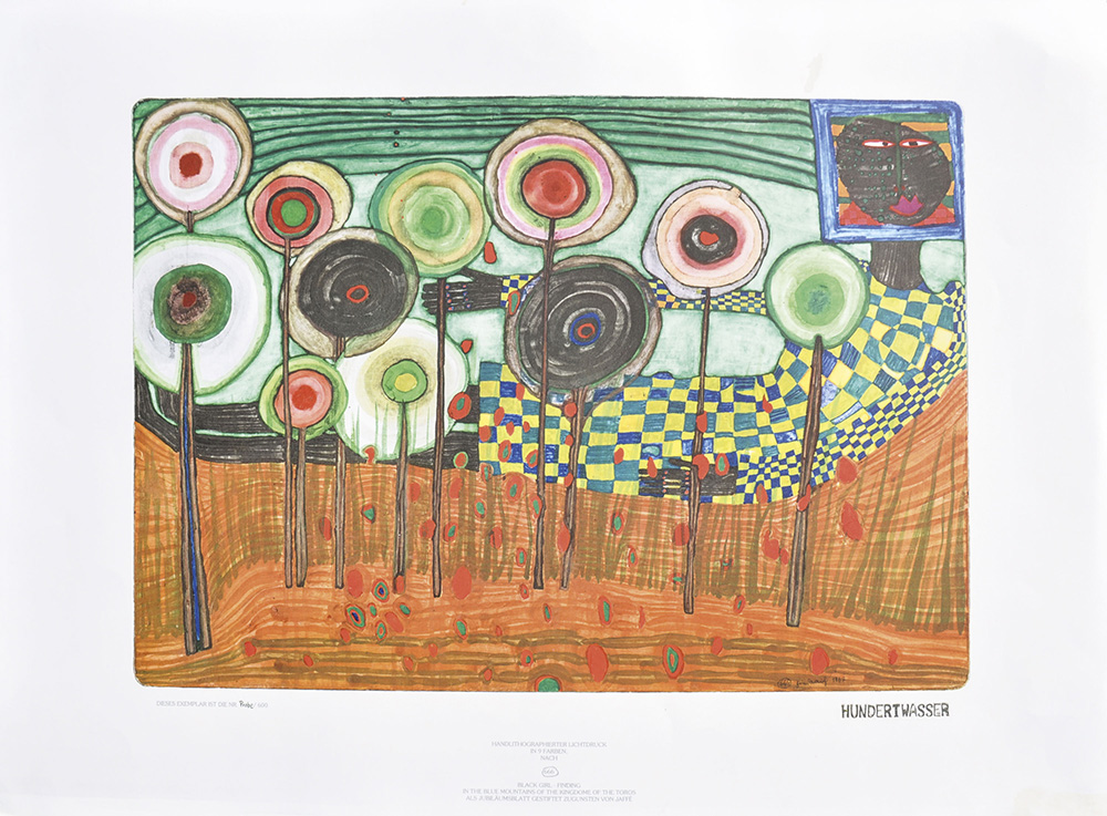 Friedensreich Hundertwasser Black girl – in the blue mountains of the kingdome of the colors, 1992;Fototipia litografata a mano nach (666), 62,5 x 85,5 cm