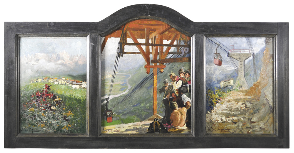 Alcide Davide Campestrini Trient/Trento 1863 – Mailand/Milano 1940), Fai della Paganella, Trentino, 1926;Trittico, olio su cartone, 48 x 96,5 cm (con cornice)