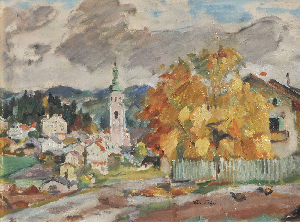 Emanuel Fohn (Klagenfurt 1881 – Bozen/Bolzano 1966), Castelrotto, 1950 ca.;Olio su cartone, 37 x 49,5 cm, in cornice