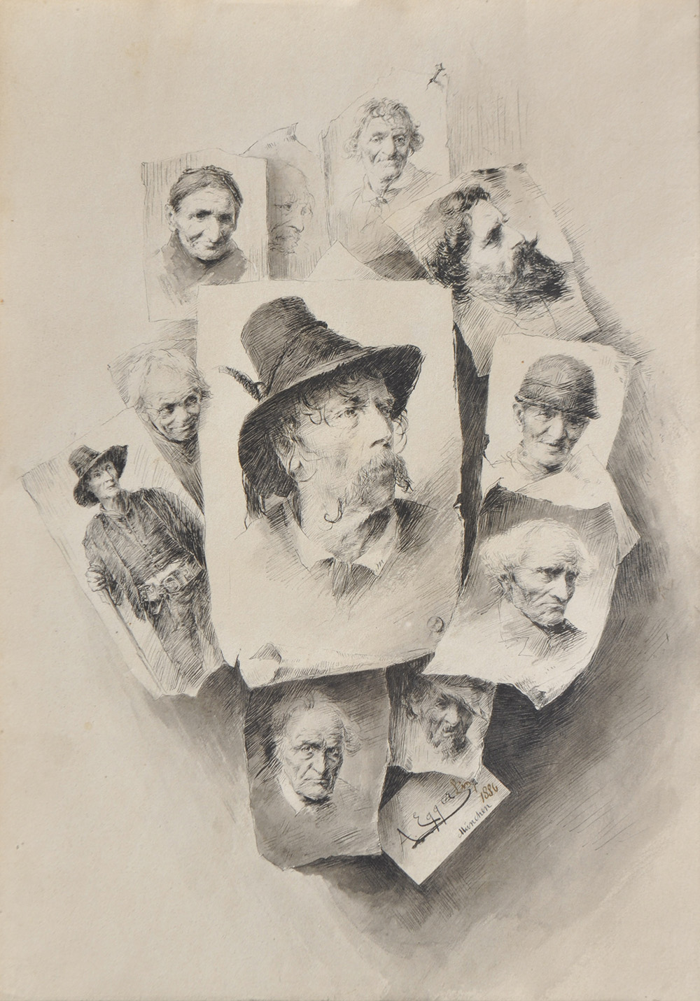 Albin Egger-Lienz (Stribach bei Linz 1868 – St. Justina bei Bozen), Undici teste caratteristiche tirolesi, 1886;Penna acquerellata, 38 x 27,5 cm