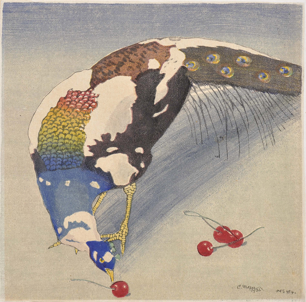 Carl Moser (Bozen/Bolzano 1873 – 1939), Pavone con macchie bianche, 1936;Xilografia colorata, 37 x 37 cm, montata, in cornice
