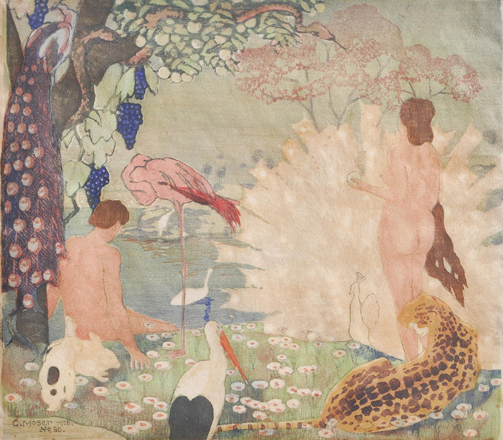 Carl Moser (Bozen/Bolzano 1873 – 1939), Paradiso, 1926;Xilografia colorata, 31,5 x 35,5 cm (immagine),