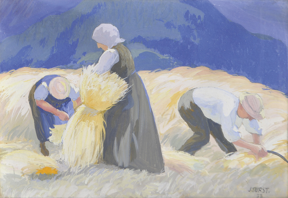 Josef Durst (Wien/Vienna 1878 – Brixen/Bressanone 1950), Raccolta del grano, 1927;Tempera su cartone, 46 x 64 cm, in cornice
