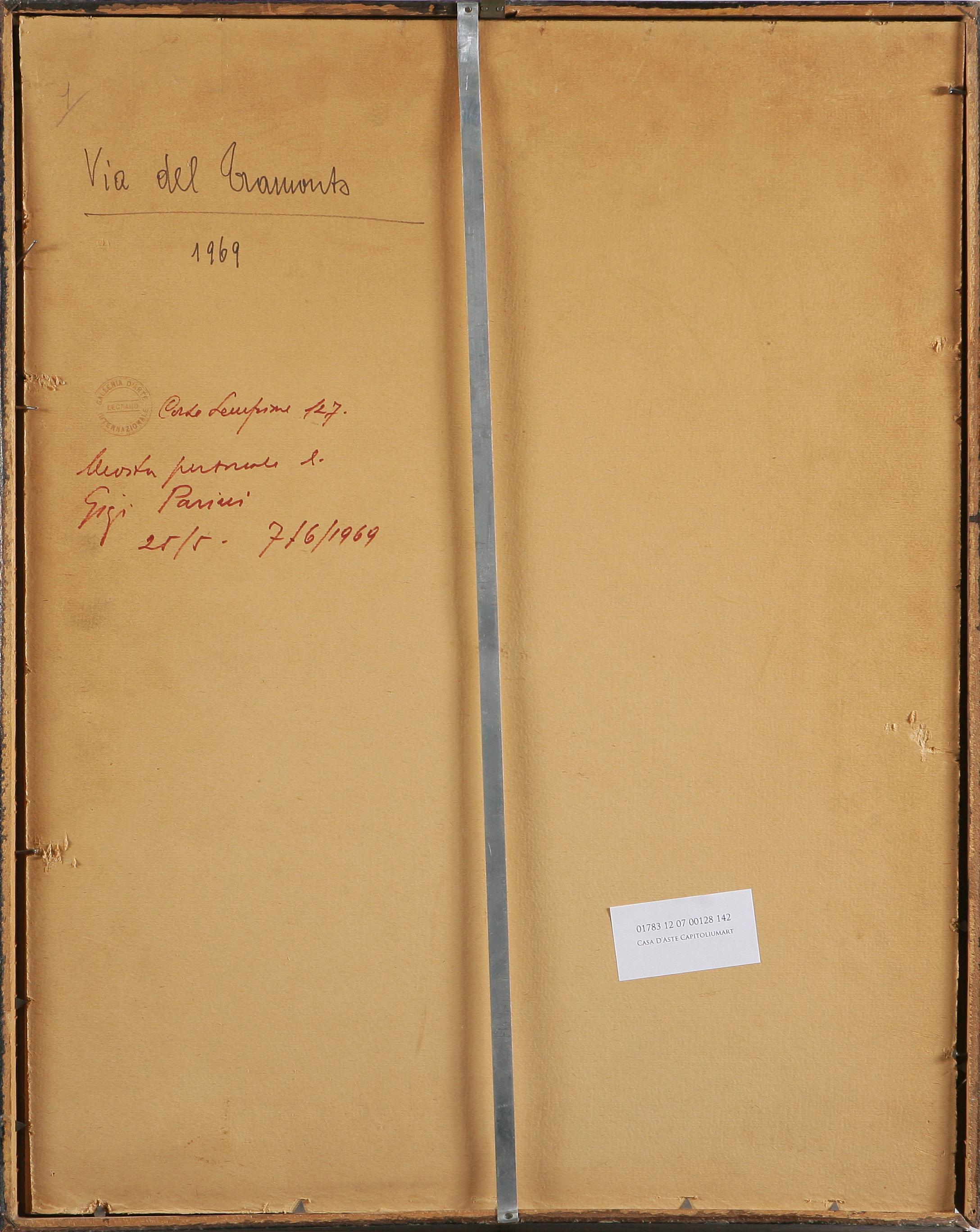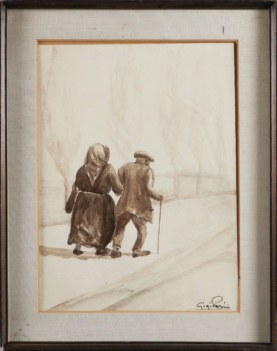 PARINI GIGI Via del tramonto. Acquerello su carta. Cm 34x46. Al retro titolo, data e timbro della Galleria d'arte Legnano. Firma in basso a destra. Cornice presente.