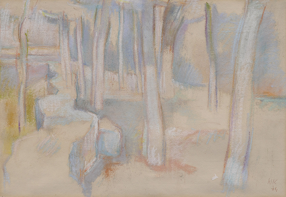 Wilfried Kirschl (Wörgl 1930 – Innsbruck 2010), Sentiero tra gli alberi, Grecia, 1974;Pastello, 24 x 35 cm (immagine), carta brunita, in cornice