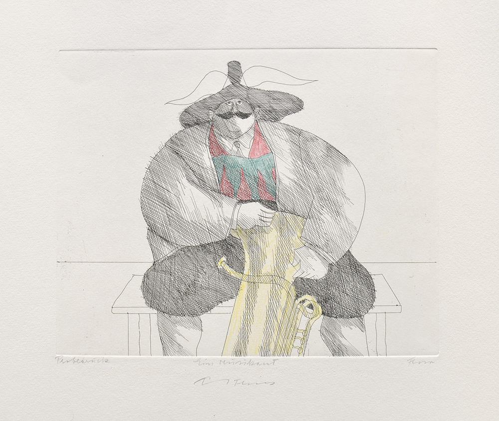 Paul Flora Glurns/Glorenza 1922 – Innsbruck 2003), Un musicista;Acquaforte colorata a mano, 19,6 x 24,2 cm (lastra)