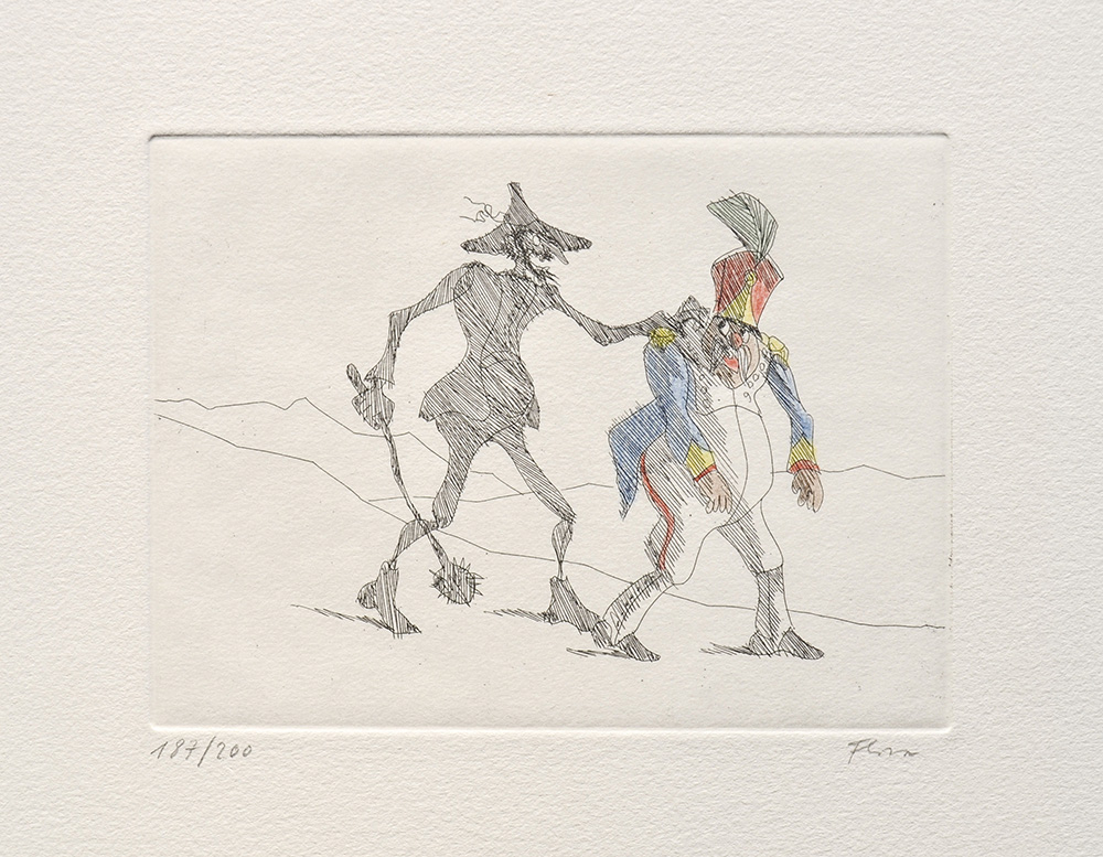 Paul Flora Glurns/Glorenza 1922 – Innsbruck 2003), Tirolese furioso con relazione colta in flagrante;Acquaforte colorata a mano, 11,6 x 15,7 cm (lastra)