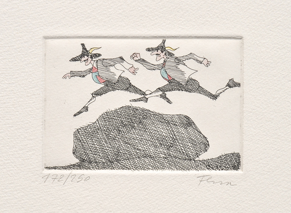 Paul Flora Glurns/Glorenza 1922 – Innsbruck 2003), Tirolesi che saltano, 1986;Acquaforte colorata a mano, 5,8 x 8,7 cm (lastra)