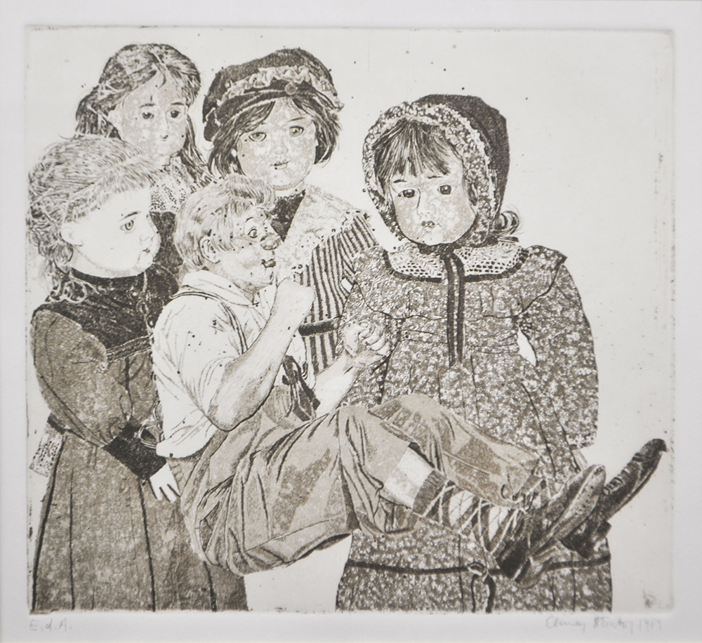 Elmar Peintner (*Zams 1954), Pagliaccio e bambola, 1989;Acquaforte, 18,5 x 20,5 cm (lastra)