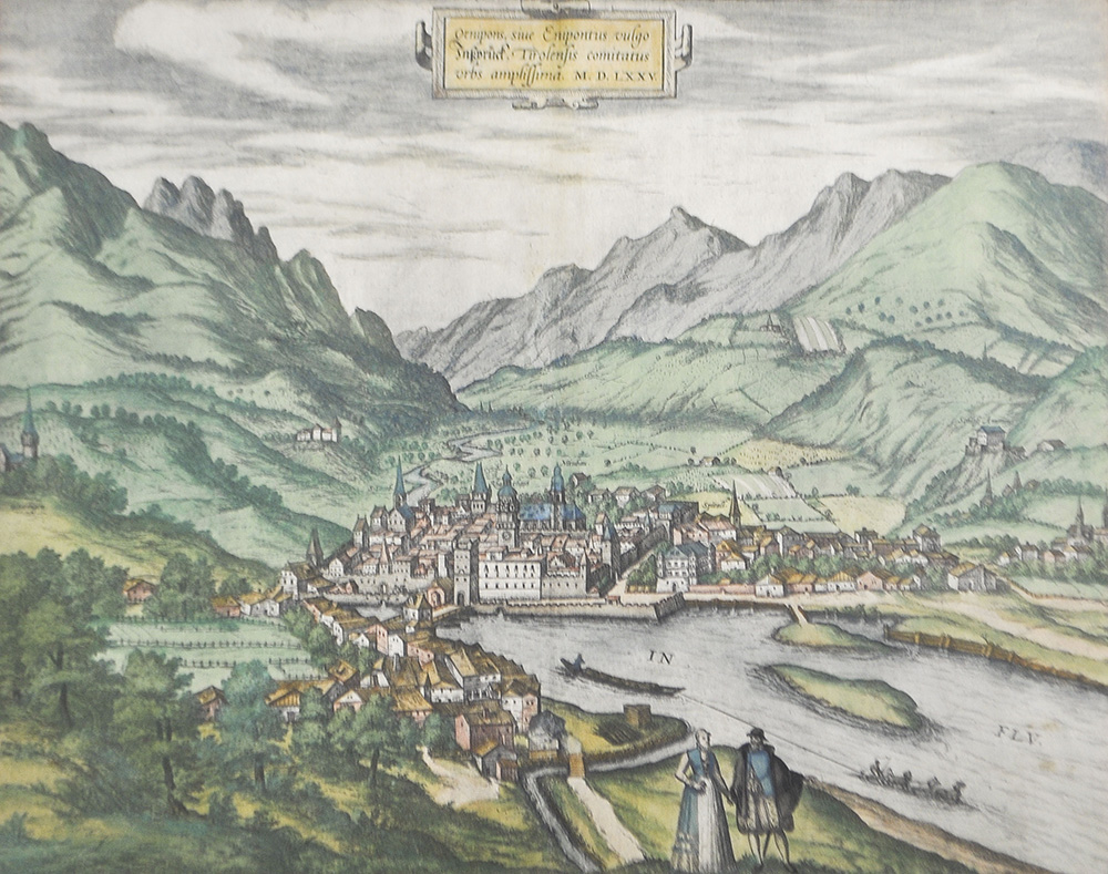 Georg Braun/Franz Hogenberg (* Zams 1939), Inspruck, um 1585;Incisione su rame colorata, 33,5 x 42 cm