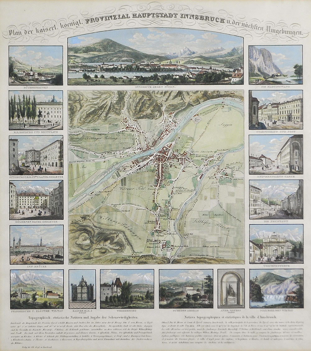Johann Groß , Plan der kaiserl. koenigl. Provinzial Hauptstadt Innsbruck;Incisione colorata, 43 x 39 cm