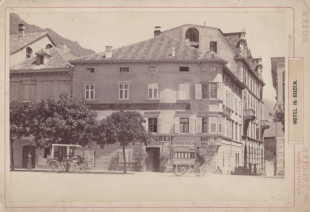 Johann Gugler / Römmler & Jonas, Dresden , Monumento a Walther von der Vogleweide..., 1887/93;Locanda Al Grifone Nero, Castel Roncolo, Parrocchia