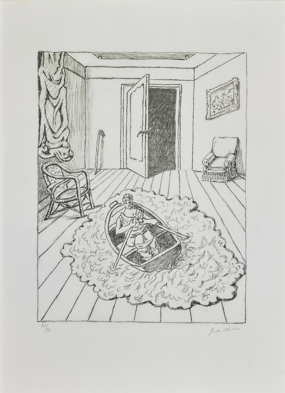 DE CHIRICO GIORGIO (1888 - 1978) Untitled (Il ritorno di Ulisse). 1973. Lithograph. Cm 50,00 x 70,00. 57/99. Edition and signature lower in pencil. Giorgio De Chirico stamp lower left. Printer: Alberto Caprini. Alberto Caprini authenticity certificate. Publication: Giorgio De Chirico 1967 -1977 by Edoardo Brandani, Bora Edition, Bologna, 1990, p.194. Telemarket authenticity certificate on photo. Total Edition: 99 exemplary numbered from 1/99 to 99/99: 20 exemplary numbered from I/XX to XX/XX; 20 exemplary on China paper on Japon numberd from I/XX to XX/XX + some p.d.a.; 21 exemplary signed from A to Z + some p.d.a and some exemplary retouched by the artist.. Cornice presente