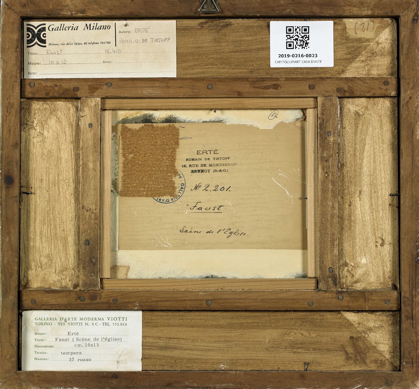 ERTE' (1892 - 1990) Faust. Tecnica mista su carta. Cm 18,00 x 12,00. Firma in basso a destra. Al retro titolo, timbro dell'artista, cartiglio descrittivo Galleria Milano e cartiglio descrittivo Galleria d'arte moderna Viotti, Torino. Provenienza: eredità Inzoli, Brescia. Parte del ricavato verrà devoluto in beneficenza come da indicazioni testamentarie. Cornice presente