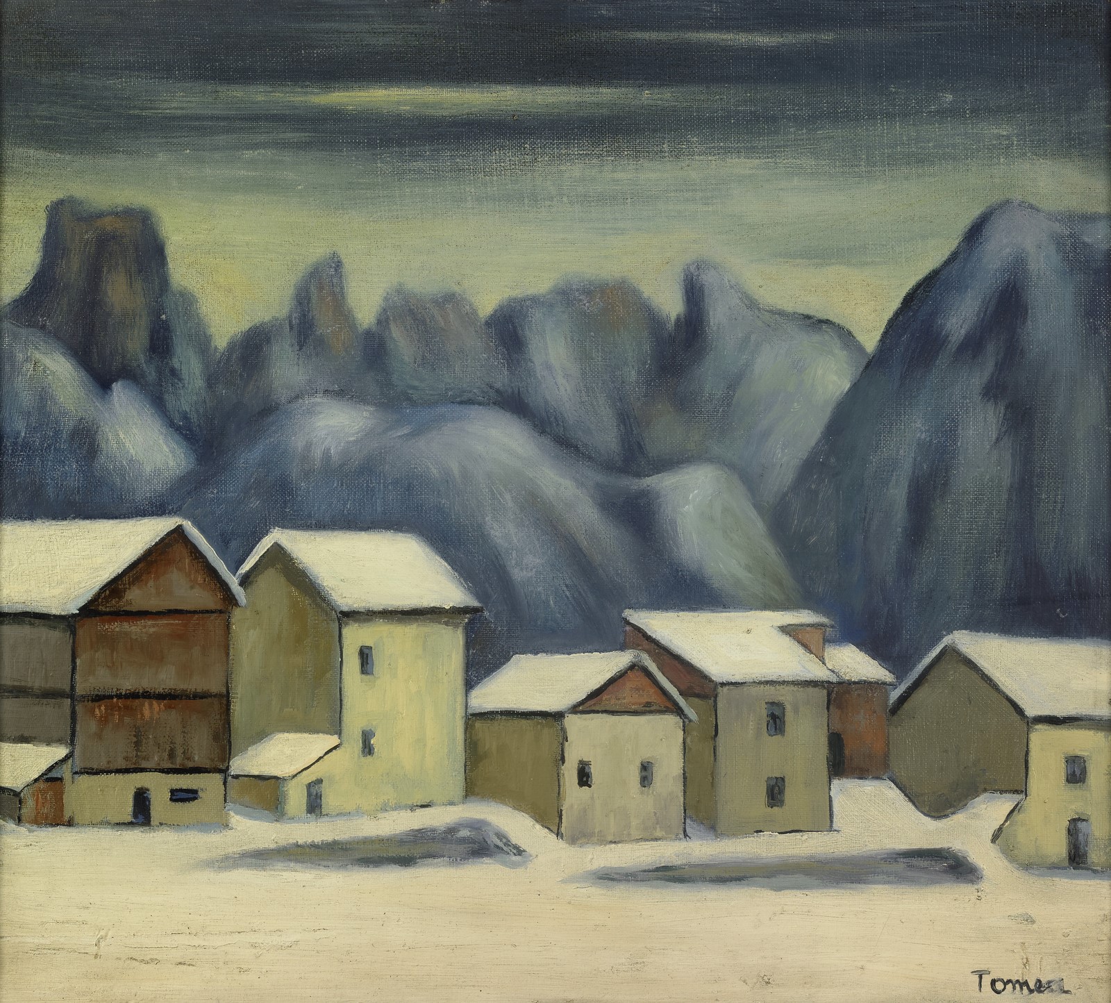 TOMEA FIORENZO (1910 - 1960) Senza titolo. Olio su cartone pressato. Cm 40,00 x 36,00. Firma in basso a destra. Al retro cartiglio descrittivo Galleria d'arte Cavalletto, Brescia e timbro descrittivo Galleria d'arte Accademia, Milano. Provenienza: eredità Inzoli, Brescia. Parte del ricavato verrà devoluto in beneficenza come da indicazioni testamentarie. Cornice presente