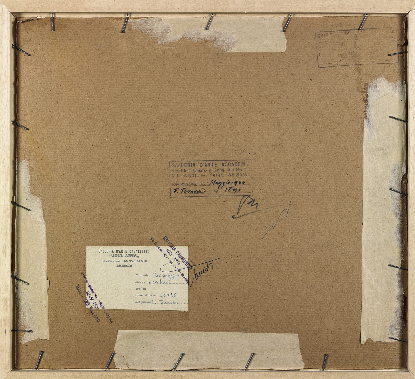 TOMEA FIORENZO (1910 - 1960) Untitled. Oil on pressboard. Cm 40,00 x 36,00. Signature lower right. At the back Cavalletto Gallery label and Accademia Art Gallery, Milan stamp. Cornice presente