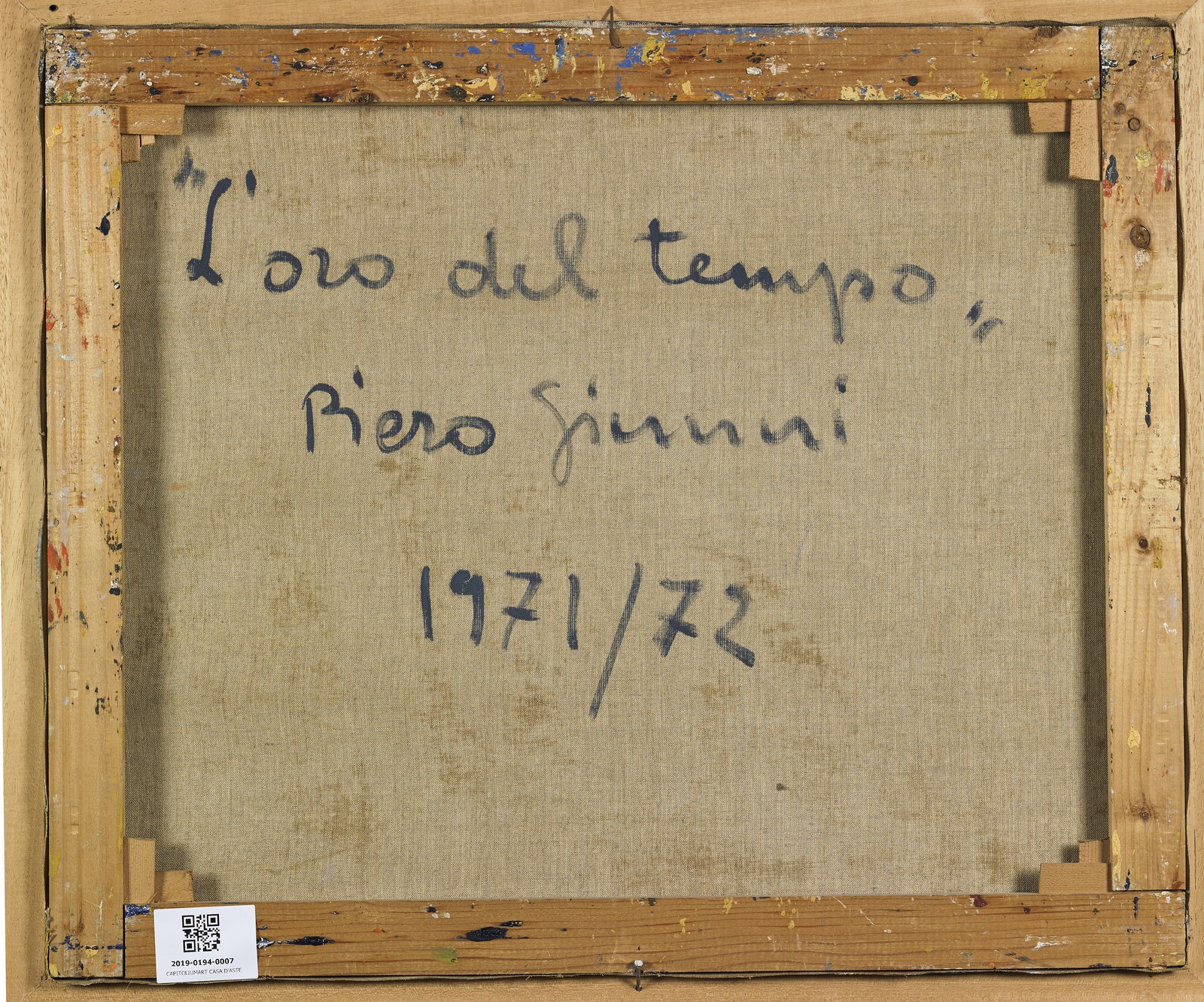 GIUNNI PIERO (1912 - 2000) The gold of the time. 1972. Oil on canvas . Cm 60,00 x 50,00. Signature and year lower right. At the back title, signature and year. 1971-1972. Il Pozzo Gallery authentcity certificate.. Cornice presente