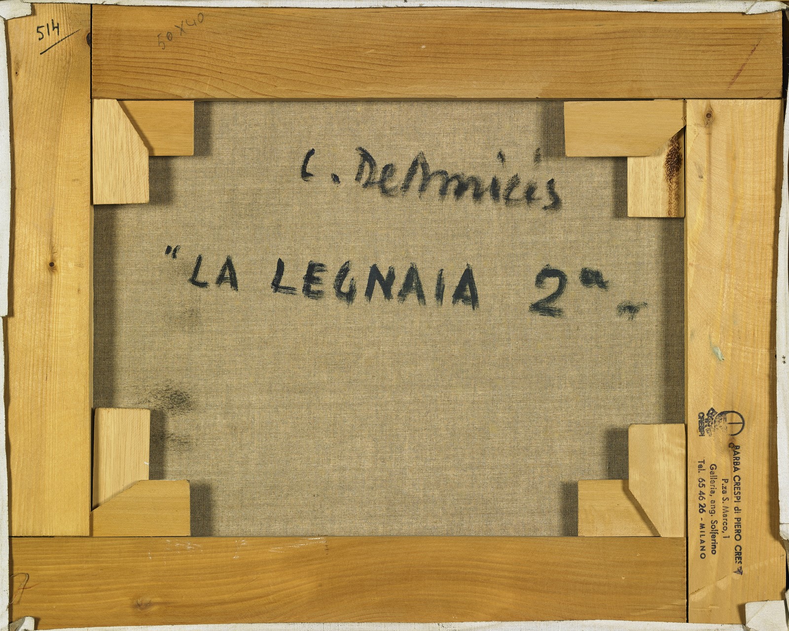 DE AMICIS CRISTOFORO (1902 - 1987) La legnaia 2. Olio su tela . Cm 60,00 x 40,00. Firma in basso a destra. Al retro titolo e firma. Provenienza: eredità Inzoli, Brescia. Parte del ricavato verrà devoluto in beneficenza come da indicazioni testamentarie. Cornice presente