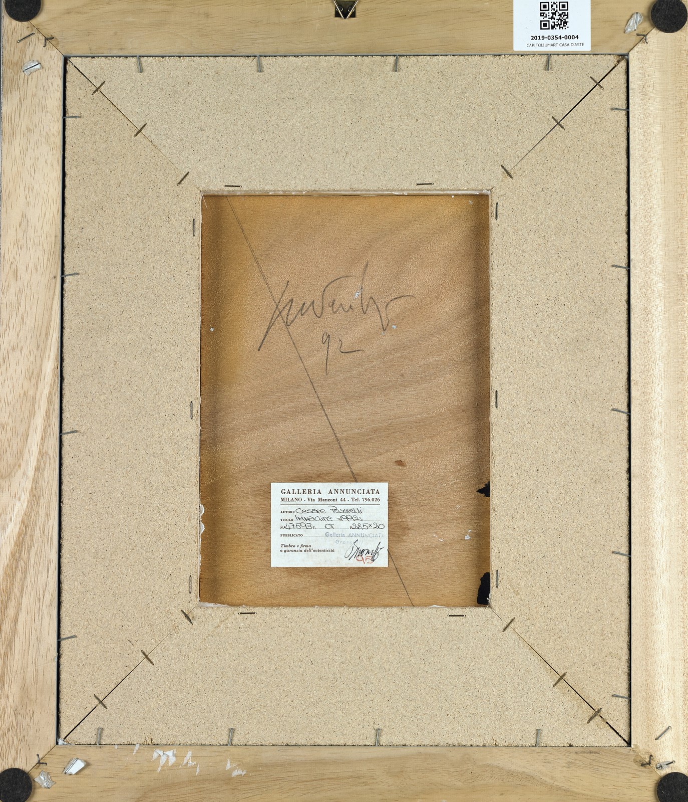 PEVERELLI CESARE (1922 - 2000) Image. 1992. Oil on board. Cm 20,00 x 28,50. Signature and year lower right. At the back signature, year and Annunciata Gallery, Milan label. Cornice presente