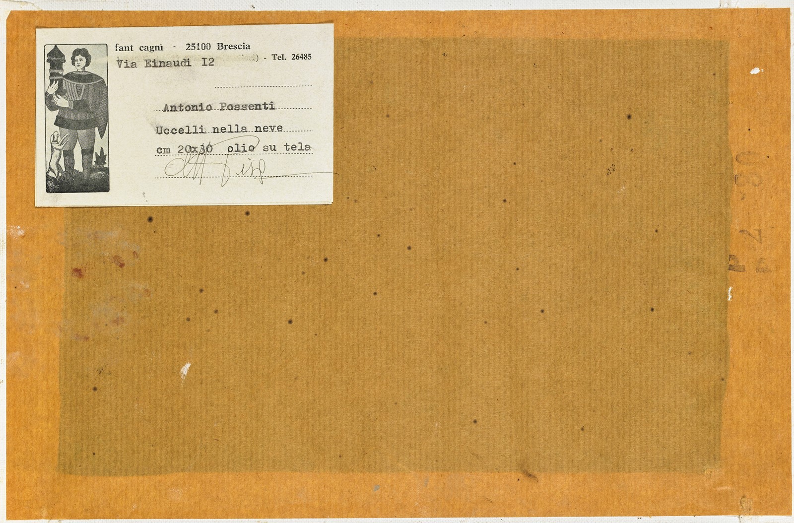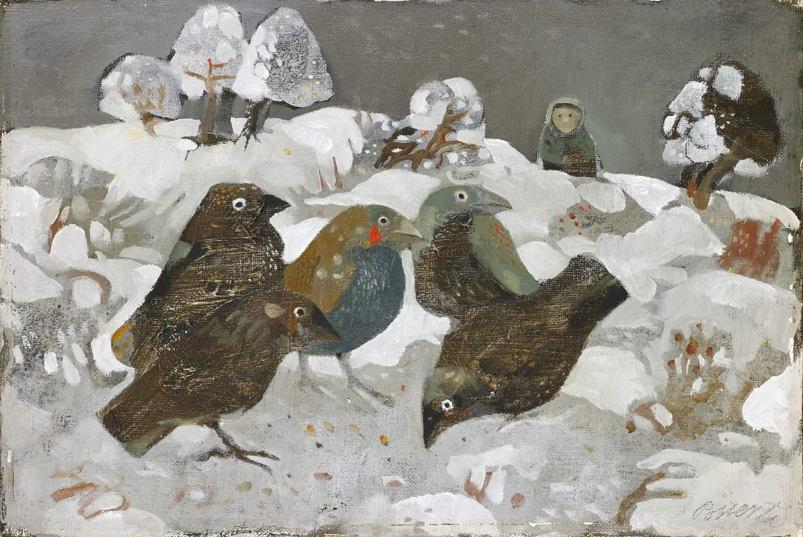 POSSENTI ANTONIO (n. 1933) Uccelli nella neve. Olio su tela . Cm 30,00 x 20,00. Firma in basso a destra. Al retro cartiglio descrittivo Fant Cagnì, Brescia. Provenienza: eredità Inzoli, Brescia. Parte del ricavato verrà devoluto in beneficenza come da indicazioni testamentarie. Cornice presente