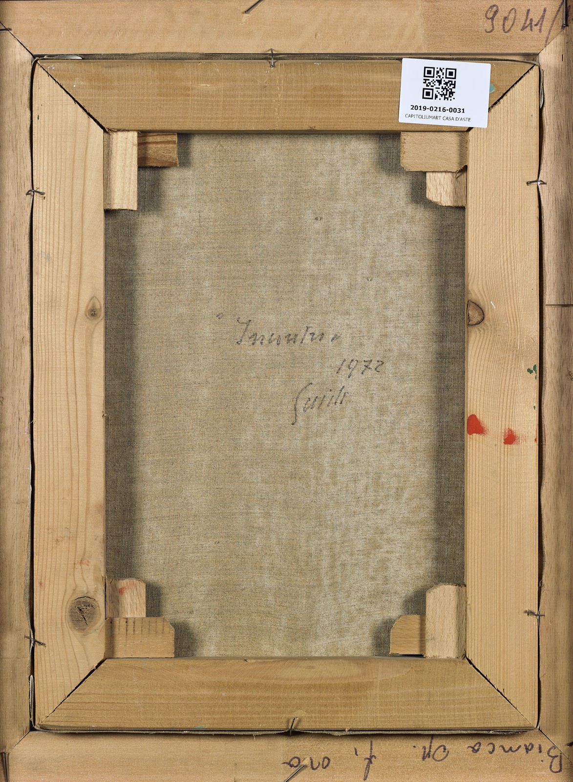 GUIDI VIRGILIO (1891 - 1994) L'incontro. 1972. Olio su tela . Cm 30,00 x 40,00. Al retro titolo, firma e anno. Presenti lievi difetti. Provenienza: eredità Inzoli, Brescia. Parte del ricavato verrà devoluto in beneficenza come da indicazioni testamentarie. Cornice presente