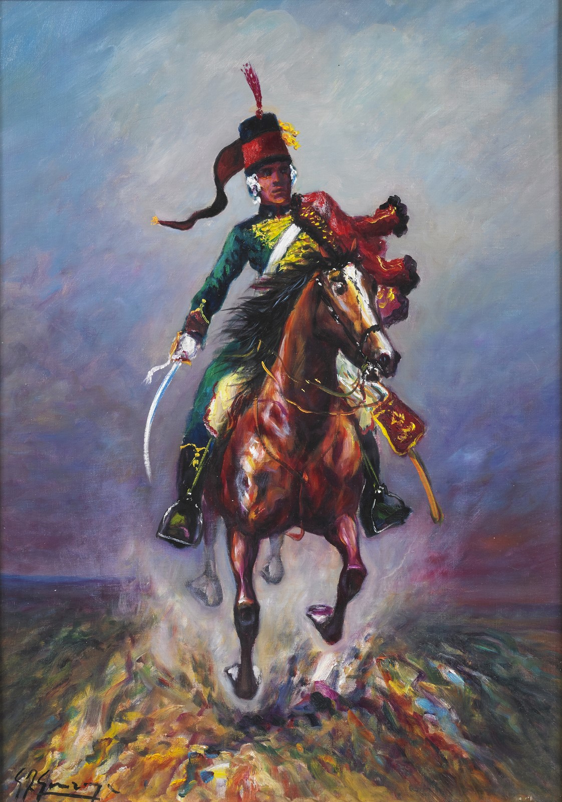 GONZAGA GIOVAN FRANCESCO (1921 - 2007) L'ussaro. Olio su tela . Cm 50,00 x 70,00. Firma in basso a sinistra. Al retro titolo e firma. Cornice presente