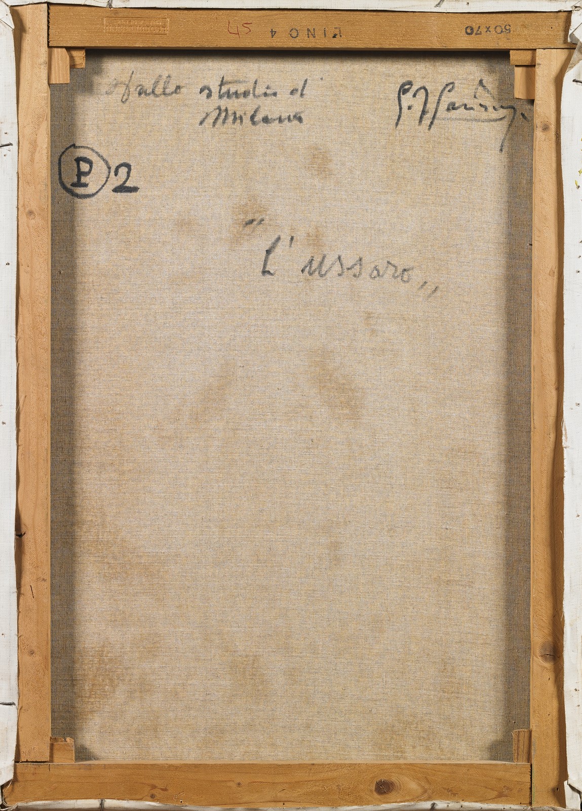 GONZAGA GIOVAN FRANCESCO (1921 - 2007) Untitled (L'ussaro). Oil on canvas . Cm 50,00 x 70,00. Signature lower left. At the back title and signature. Cornice presente
