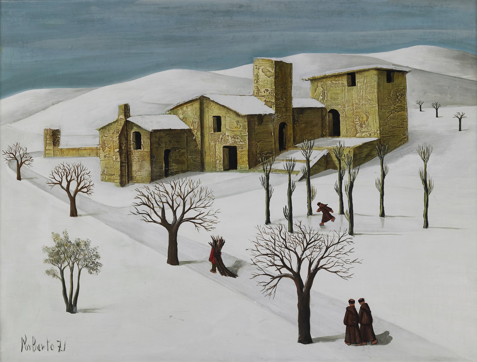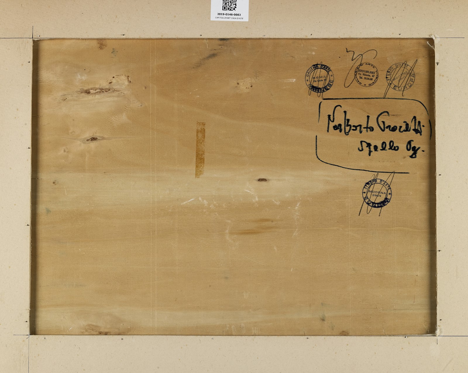 PROIETTI NORBERTO (1927 - 2009) Senza titolo. 1971. Olio su tavola. Cm 60,00 x 48,00. Firma e anno in basso a sinistra. Al retro firma, timbro della Galleria Farnese, Roma; timbro della Galleria d'arte Vitruvio, Milano e timbro Studio d'arte Europa, Modena.