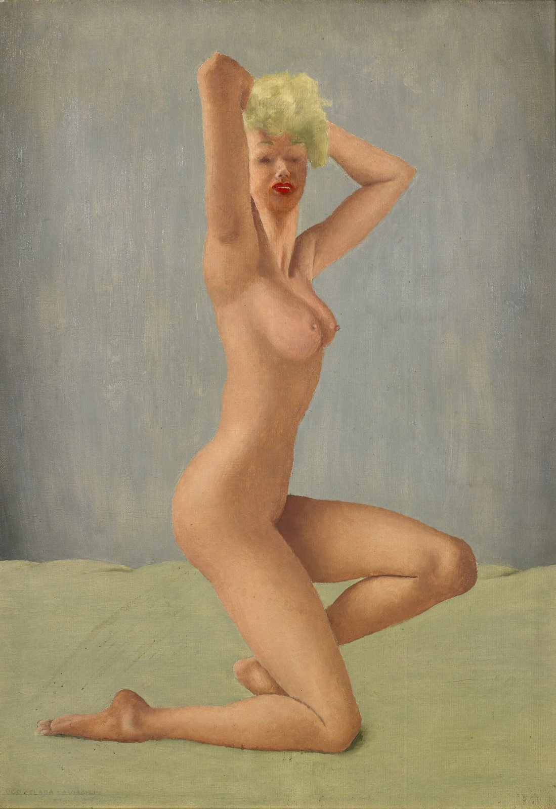 CELADA DA VIRGILIO UGO (1895 - 1995) Nudo in ginocchio. Tecnica mista su tela. Cm 50,00 x 70,00. Firma in basso a sinistra. Cornice presente