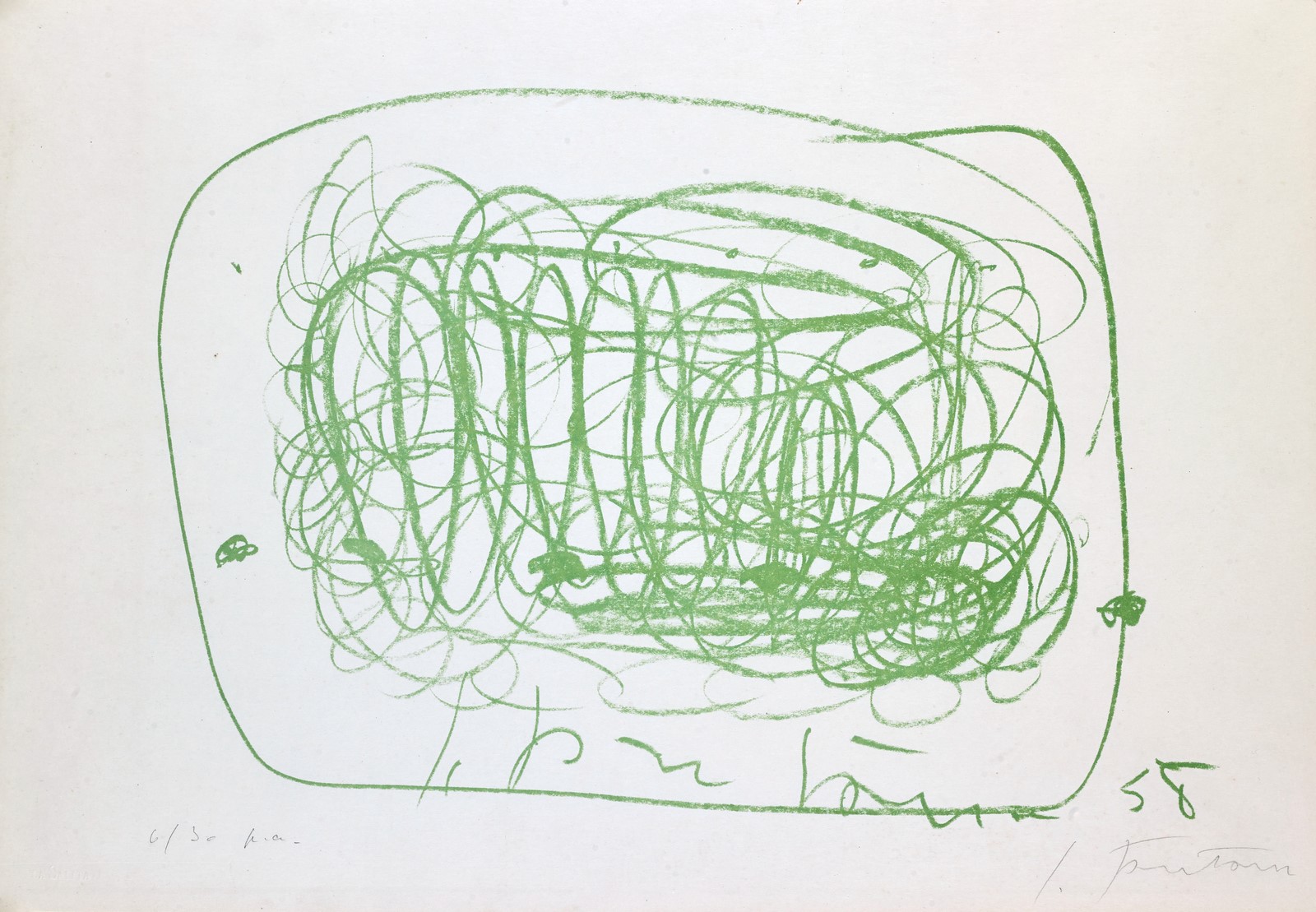 FONTANA LUCIO (1899 - 1960) Untitled. 1958. Lithograph. Cm 50,40 x 34,80. 6/30 p.d.a. Edition and signature lower in pencil. Signature and year in plate lower right. La Salta stamp lower left. Total edition: 70 exemplary (+ 30 p.d.a in Arabic numbers, +30 exemplary HC in Roman numbers, + some p.d.a.), signed and numbered with La Salita Gallery stamp. Printer: Roberto Bulla, Rome. Editor: La Salita Gallery, Rome. Bibliography: Harry Rhué - Camillo Rigo, p.109. Cornice presente