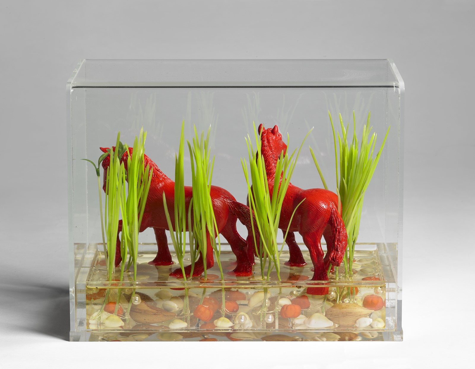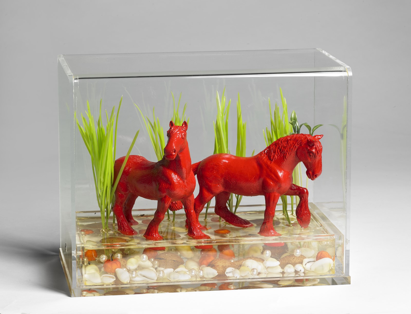 SWEETLOVE WILLIAM (n. 1949) Cloned red horse. . Resina epossidica e plastica. Cm 29,00 x 28,00 x 15,00. Autentica dell'artista su fotografia. . Cornice presente