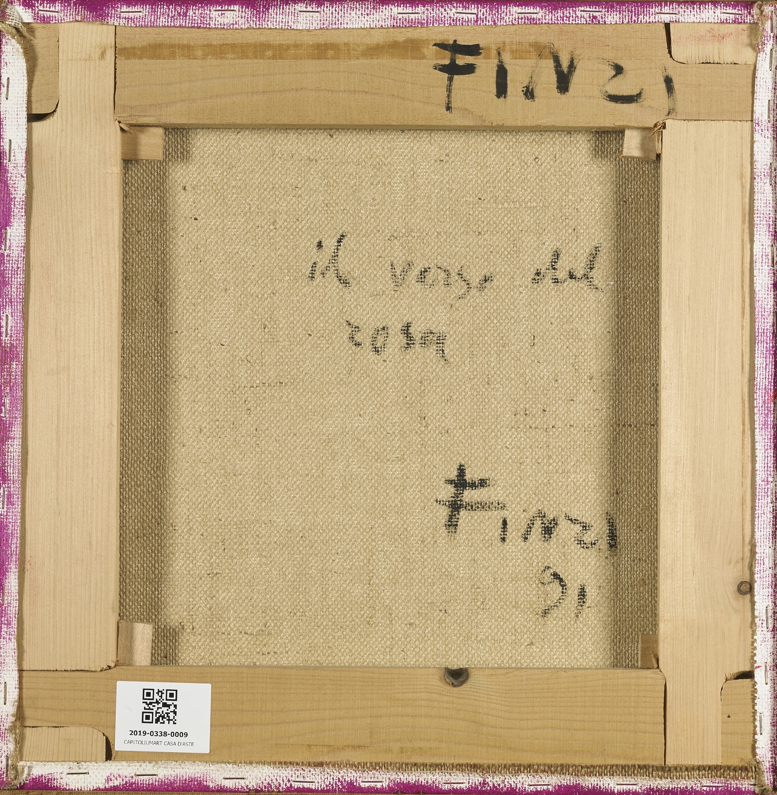 FINZI ENNIO (n. 1931) Il verso del rosa. 1991. Olio su tela . Cm 45,00 x 45,00. Al retro titolo, firma e anno. Autentica dell'artista su fotografia. Cornice presente