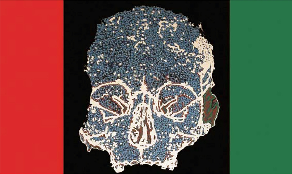 Augusto Poderosi, Su ogni bandiera appare la morte Smalto su tela, 99cm x 158cm. Autentica su foto dell'artista