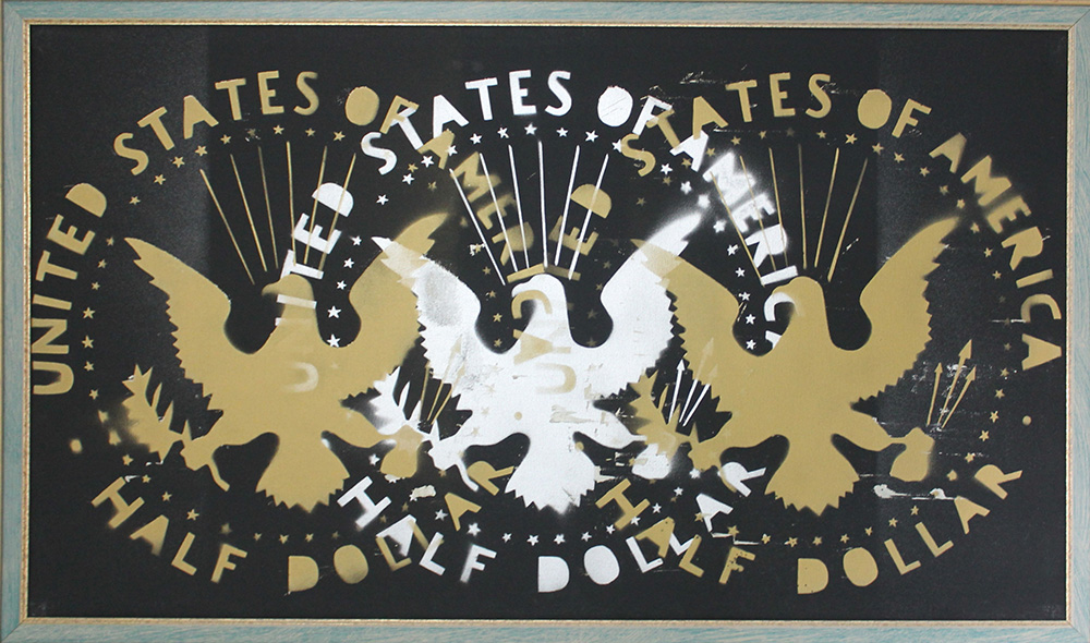 Franco Angeli, Half Dollar 1987 Smalto oro e argento spray, 70cm x 120cm....