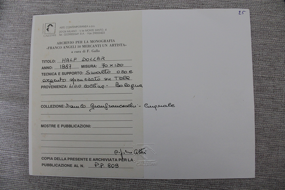 Franco Angeli, Half Dollar 1987 Smalto oro e argento spray, 70cm x 120cm. Provenienza Livio Collina archivio su foto pubblicazione n. p.p. 809